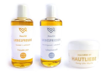 Die Liebe in Form dieser Öle + Creme nach moe's Rezeptur bringen deine Haut zum strahlen, wirken heilsam und führen dich in dein Wohlbefinden mit dir.